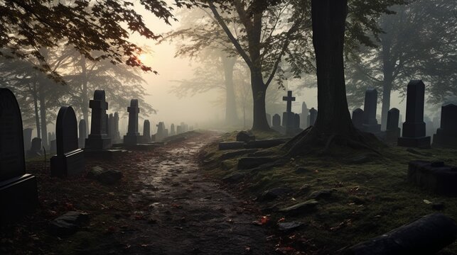Mysterious skeletal grim reaper figure with scythe in gothic landscape