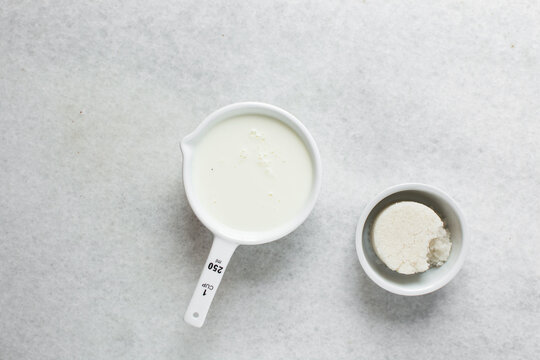 Overhead view of mise en place of ingredients for making custard, egg sugar and milk in ceramic ramekins, process of making custard