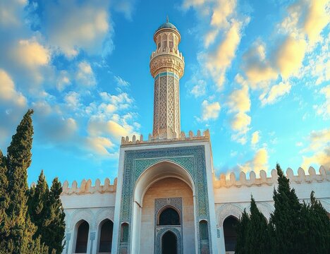 Sunlit ornate mosque with tall patterned minaret, arched mosaic entrance, crenellated parapet, cypress trees and golden clouds creating a serene, majestic atmosphere