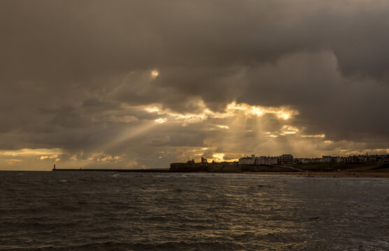 Crepuscular rays shine down on Tynemouth, the Priory & the pier in the northeast of England on a cloudy day