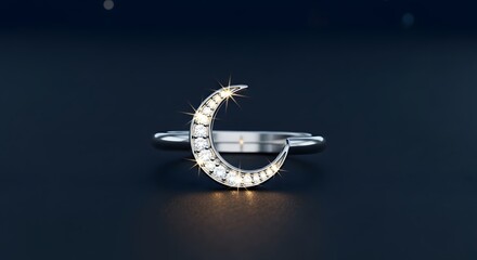 Diamond crescent moon ring sparkling brightly on a dark blue background luxury jewelry concept elegant design gift idea anniversary celebration