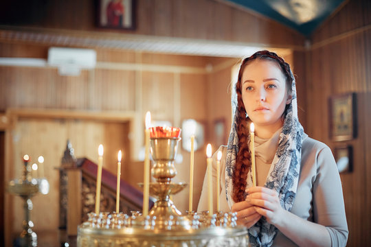 woman in the Russian Orthodox Church with red hair and a scarf on her head lights a candle and prays in front of the icon.