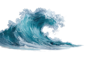A powerful tsunami wave, cresting dramatically, isolated on a white background, representing natural forces and disaster.