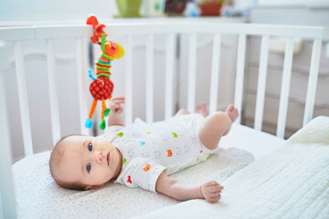 Adorable happy baby boy in white bodysuit hugging teddy bear and lying down on back on mattress in crib at home room. 6 months old infant playing with first friend. Closeup. Top down view.