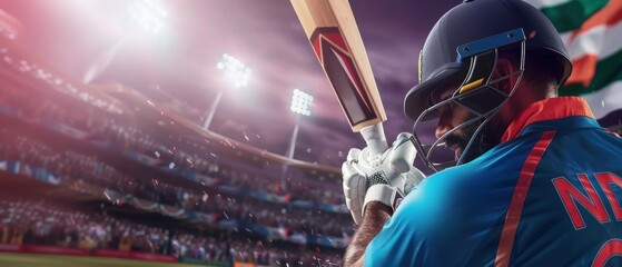 Night Game Intensity. Man, cricket player focus under stadium lights, showing readiness to compete. Electrifying atmosphere of high-stakes night match.