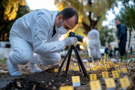 A forensic investigator in protective gear meticulously photographing a crime scene, emphasizing the importance of detailed documentation in criminal investigations.