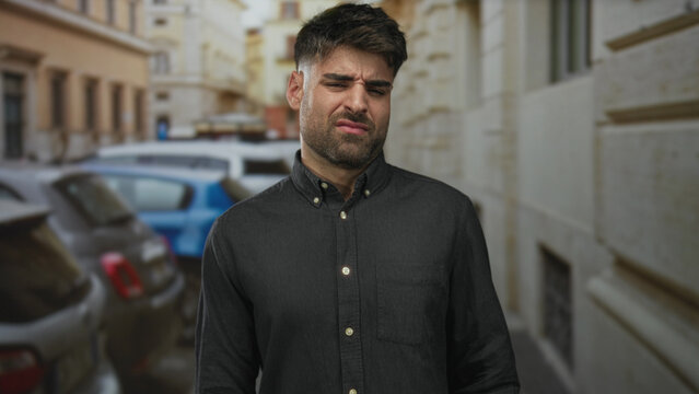 Man in black buttondown shirt grimaces with tightly closed eyes and tense face on narrow cobbled city street; disgust.