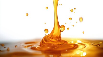 Close-up of golden liquid pouring and splashing, creating droplets and ripples with a shiny and smooth texture, conveying fluidity and motion
