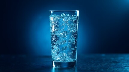 Refreshing Glass of Sparkling Water with Ice, Blue Background