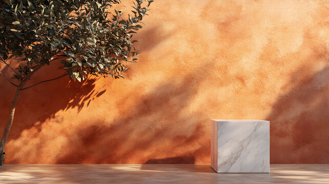 Minimalist white folding cards on pedestals with leaf shadows
