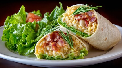 Delicious Breakfast Burrito with Crispy Bacon, Scrambled Eggs, and Fresh Lettuce Closeup View