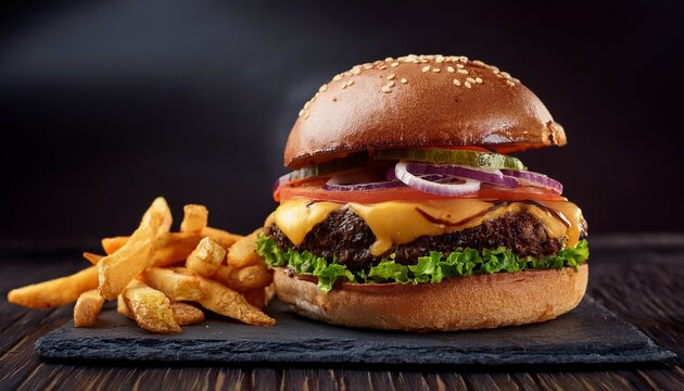 Gourmet Crispy Chicken Burger with Cheese and Fries on Rustic Cafe Table