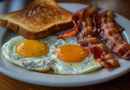 Delicious Breakfast Plate with Fried Eggs, Crispy Bacon, and Toast