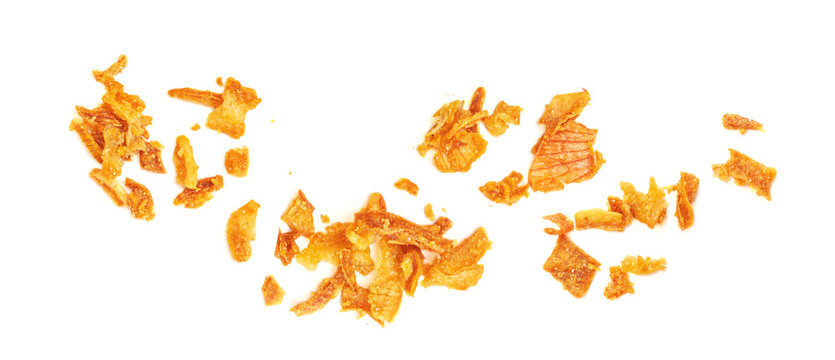 Pile of crispy fried onions isolated on white.  Roasted Onions Top view. Flat lay.