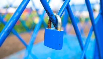 A close-up of a vibrant blue padlock secured to a network of crisscrossing blue metal bars.