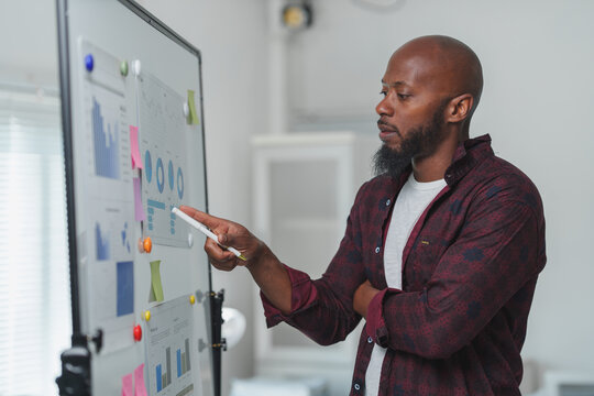Business professional analyzing charts and graphs on a whiteboard, focused on data-driven decision-making. Engaging in strategic planning and assessment in a modern office environment