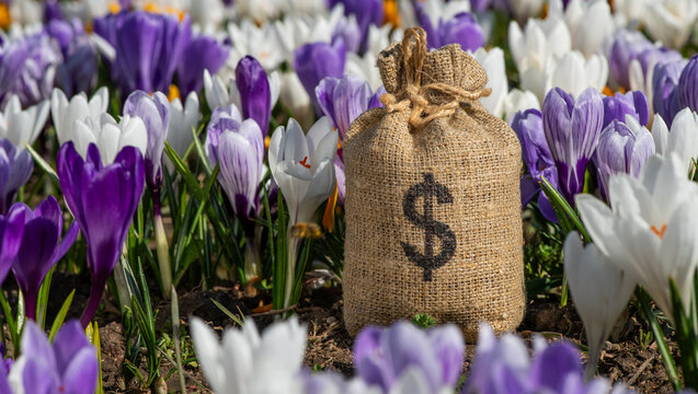 Money bag with US dollar symbol on a background of blooming crocus flowers