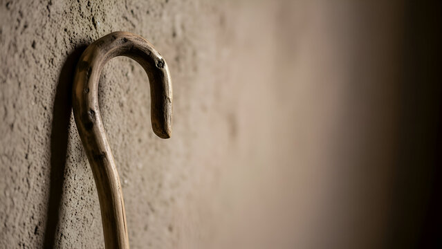 Shepherd's crook rests against a weathered stone wall in a dimly lit stable, evoking a sense of rustic simplicity and timeless tradition.