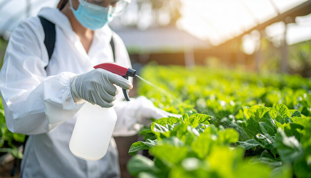 agricultural Farmers in protective Suits and mask Spraying pesticides on Crop in Farm Field