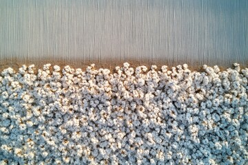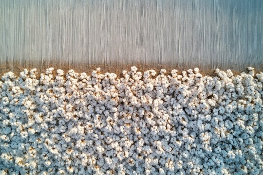 Aerial view of a vast cotton field, showcasing rows of fluffy white cotton bolls ready for harvest.