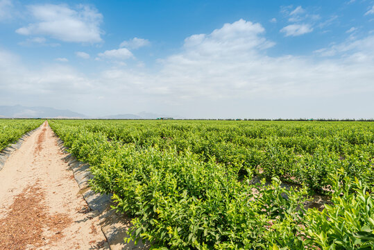Field of blueberries, bushes with future berries against the blue sky. Farm with berries.