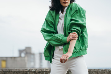 Young woman in cropped sweater with a high neck and long sleeves. Isolated on white background