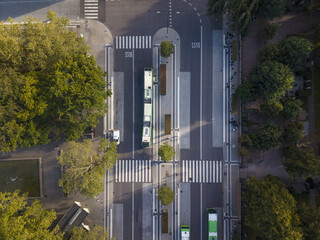 Aerial view of trams gliding through the city's veins, bordered by verdant trees and crisp pedestrian crossings, Malmo, Skane County, Sweden.