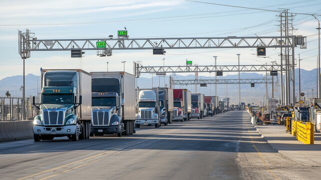 Cars waiting at the border between Canada and the United States. Hot day, hot air waves over hot cars.