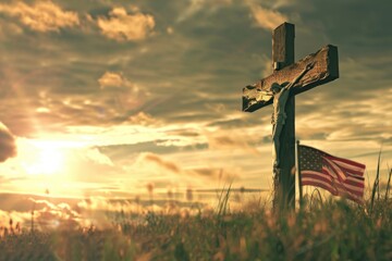 Christian cross necklace on American flag. For US Memorial Day, Veterans Day, USA memorial or military funeral. Representing honor and sacrifice of the armed forces from the United States of America.