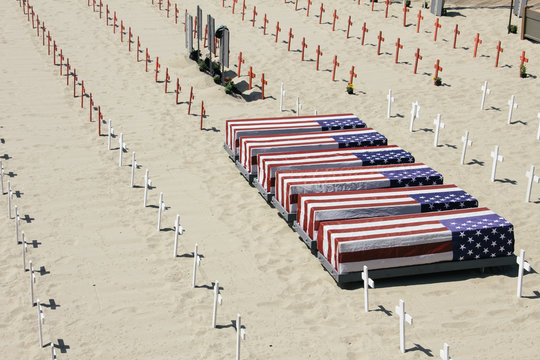 Coffins covered with american flag on a memorial on the beach