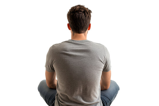 Man sitting cross legged from the back in gray shirt Isolated on transparent background, PNG