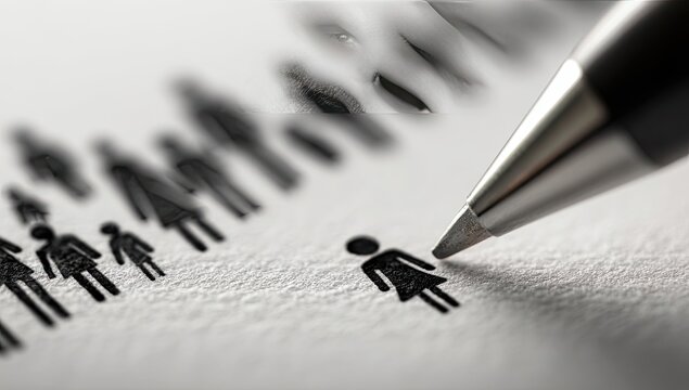 Close-up of a pen tip about to cross out a single female figure from a row of family figures