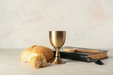 Cup of wine with bread, Holy Bible and cross on light background