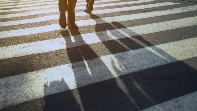 Pretty young woman crossing the street while holding the smartphone and looking sideways.