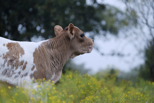 Spotted crossbred beef calf on Texas farm during overcast fall day.