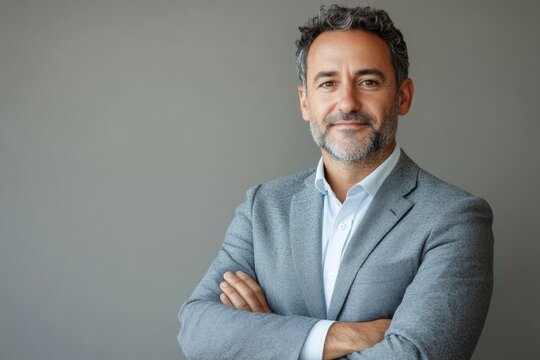 businessman standing with hands crossed and looking at camera happy