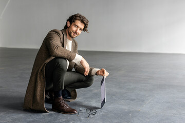 Crouching modern performer in artistic studio environment