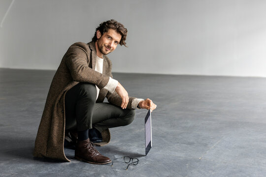 Smiling businessman with digital tablet crouching on floor