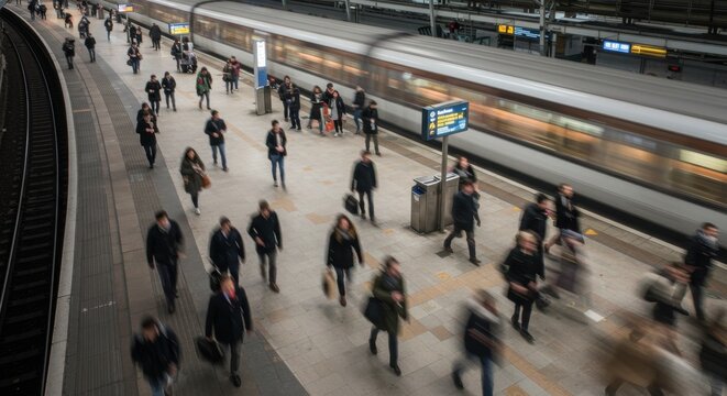 At a bustling urban train station during a chilly winter evening, commuters hurry to catch their trains. Clusters of people move briskly along the platform, some checking schedules while others talk