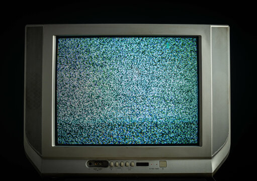 Vintage analog television with static noise in dim lit room