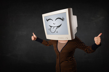 Retro CRT monitor head businessman surrounded by chat bubbles | Conceptual AI conversation and digital communication illustration | Man in suit with television head and pixelated smiley face | Vintage