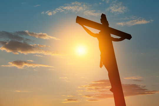Silhouette of the crucified Jesus Christ on the cross on background of sunset sky.