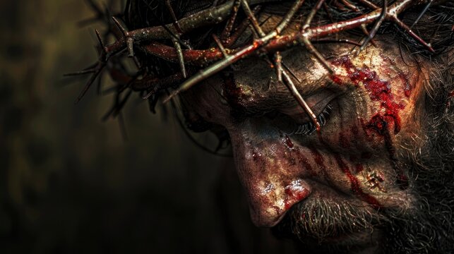 Christ with crown of thorns. Conveys spiritual depth. Easter-themed photography.