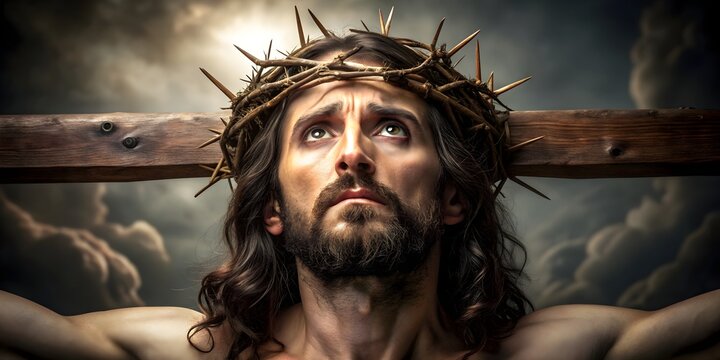 Jesus Christ crucyfied wearing crown of thorns Passion and Resurection. Good Friday. Generative AI