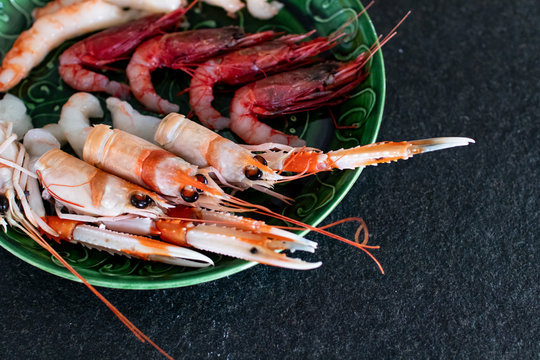 Delicious raw crustacean, luxury mix of fresh shellfish on a green plate. Prawns, scampi and fresh red prawns ready to eat raw. Raw fish dish