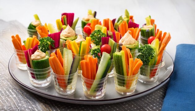 a platter of colorful and crunchy crudite cups with hummus or creamy dip