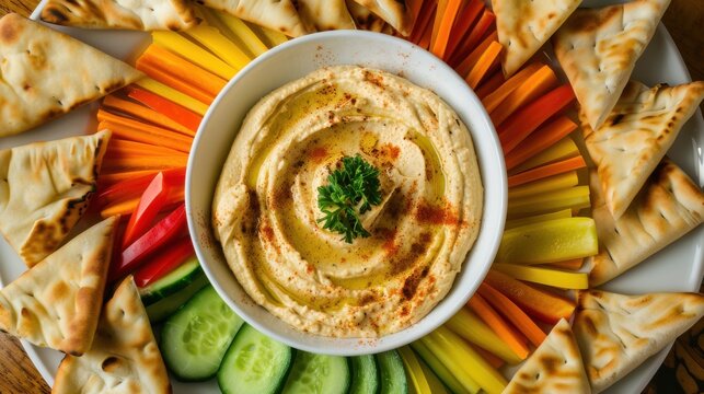 A platter of creamy hummus surrounded by colorful crudites such as carrots, cucumbers