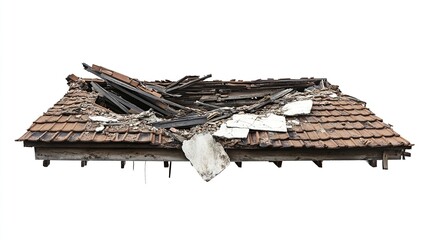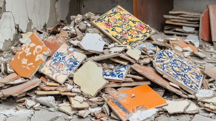 A chaotic pile of broken ceramic tiles with colorful floral patterns lies amidst demolition debris