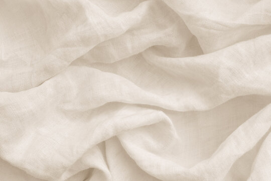 Close-up of natural linen textured bedding in neutral beige colors. Soft, crumpled fabric on bed with pillows, creating tranquil, sophisticated bedroom aesthetic. Comfortable, eco-friendly home