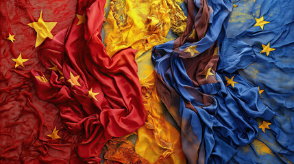 A close up of a crumpled EU blue flag with yellow stars. Generative AI image.
